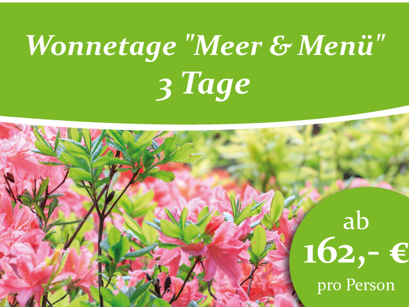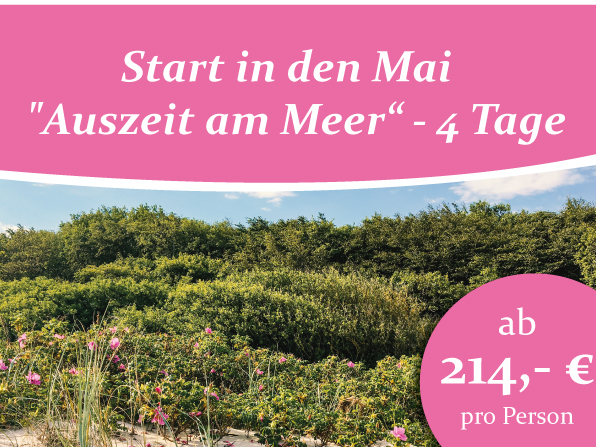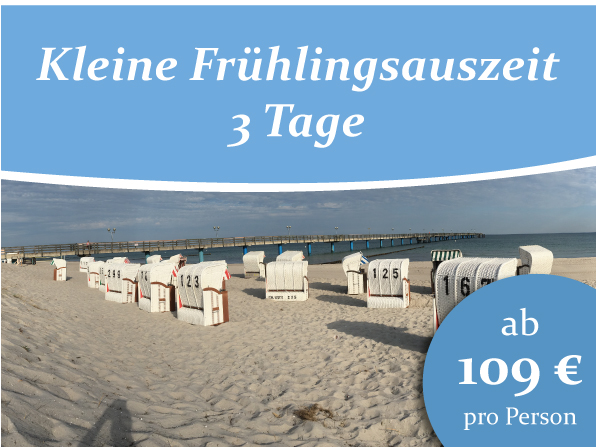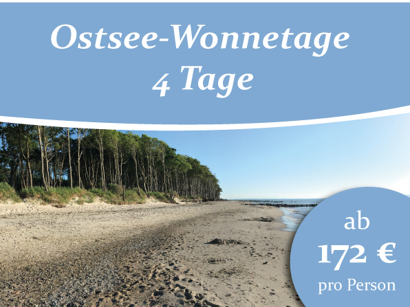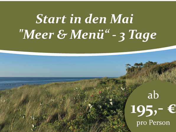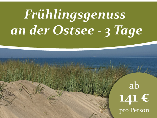 ANGEBOTE Frühlingsgenuss an der Ostsee - 3 Tage Buchbar im Zeitraum von 06.04. – 30.04. (Anreise Mi-So) – 2 Übernachtungen inkl. Frühstücksbuffet– Obstarrangement / 1 x Fl. Wein– 1 Flasche Mineralwasser– 1 x Candle-Light-Dinner Preis für 2 Personen im DZ Maritim 282,- € jede weitere ÜN 112,-€ Preis für 2 Personen im DZ Komfort Balkon 286,- € jede weitere ÜN 115,-€ Preis für 2 Personen im DZ Maritim Plus 297,- € jede weitere ÜN 120,-€ Jetzt buchen Kleine Frühlingsauszeit - 3 Tage Buchbar im Zeitraum von 06.04. – 30.04. – 2 Übernachtungen inkl. Frühstücksbuffet– Obstarrangement / 1 x Fl. Wein– 1 Flasche Mineralwasser Preis für 2 Personen im DZ Maritim 218,- € jede weitere ÜN 112,-€ Preis für 2 Personen im DZ Komfort Balkon 222,- € jede weitere ÜN 115,-€ Preis für 2 Personen im DZ Maritim Plus 232,- € jede weitere ÜN 120,-€ Jetzt buchen Start in den Mai "Meer & Menü" - 3 Tage Anreise: 30.04.-03.05.2026 – 2 Übernachtungen inkl. Frühstücksbuffet– Obstarrangement / 1 x Fl. Wein– 1 Flasche Mineralwasser– 1 x Candle-Light-Dinner Preis für 2 Personen im DZ Maritim Plus 388,- € jede weitere ÜN 123,-€ Preis für 2 Personen im DZ Komfort Balkon 388,- € jede weitere ÜN 123,-€ Jetzt buchen Start in den Mai "Auszeit am Meer" - 4 Tage Anreise: 30.04.-03.05.2026 – 3 Übernachtungen inkl. Frühstücksbuffet– Obstarrangement / 1 x Fl. Wein– 1 Flasche Mineralwasser Preis für 2 Personen im DZ Maritim 428,- € jede weitere ÜN 108,-€ Preis für 2 Personen im DZ Maritim Balkon 458,- € jede weitere ÜN 111,-€ Jetzt buchen Wonnetage "Meer & Menü" - 3 Tage Reisezeitraum: 03.05.-13.05.2026 – 2 Übernachtungen inkl. Frühstücksbuffet– Obstarrangement / 1 x Fl. Wein– 1 Flasche Mineralwasser– 1 x Candle-Light-Dinner Preis für 2 Personen im DZ Maritim Plus 334,- € jede weitere ÜN 123,-€ Preis für 2 Personen im DZ Komfort Balkon 324,- € jede weitere ÜN 117,-€ Jetzt buchen Ostsee -Wonnetage - 4 Tage Reisezeitraum: 03.05.-13.05.2026 – 2 Übernachtungen inkl. Frühstücksbuffet– Obstarrangement / 1 x Fl. Wein– 1 Flasche Mineralwasser Preis für 2 Personen im DZ Maritim 344,- € jede weitere ÜN 108,-€ Preis für 2 Personen im DZ Maritim Balkon 352,- € jede weitere ÜN 111,-€ Jetzt buchen
